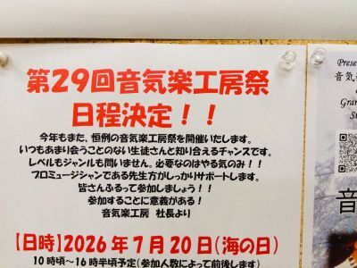 皆さま~ 今年の音気楽工房祭の日程が 早々決まってしまいました~!! 今年は夏です 7月20日(月・...